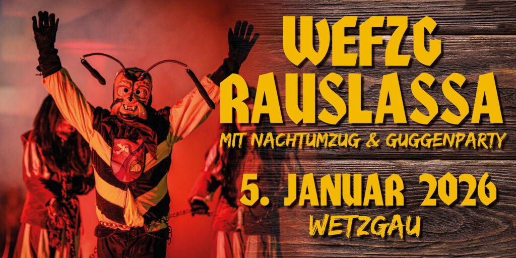 WEFZG RAUSLASSA 2026 Am Montag, 5. Januar 2026 heißt es wieder FASNET ISCH! Mit dem Wefzg rauslassa startet in Rehnenhof-Wetzgau die Fasnet und das närrische Treiben. Auf dieser Seite wollen wir euch über das wildeste Event des Jahres informieren! Narrenwecken Nachtumzug Guggenparty